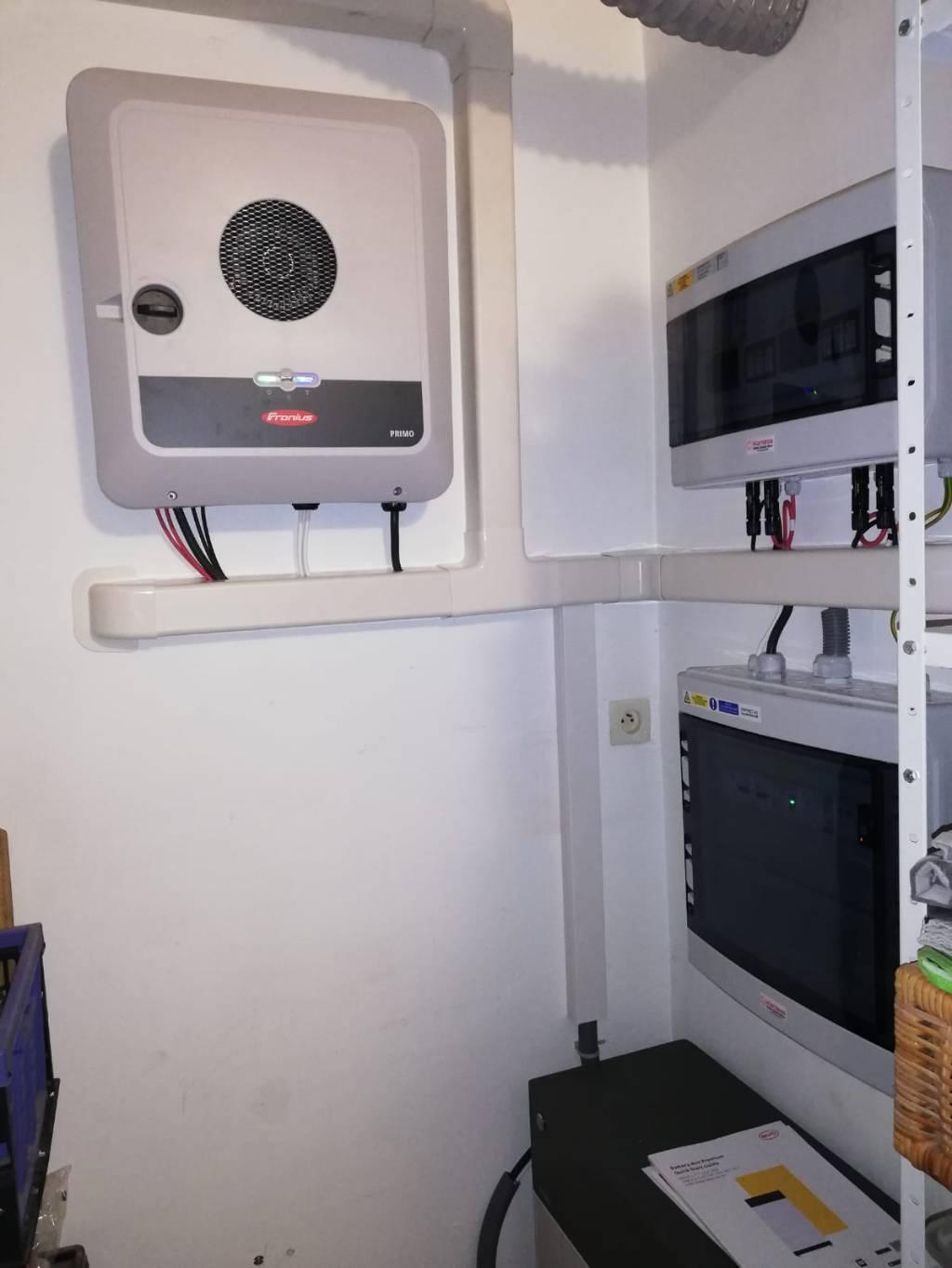 Pour assurer le bon fonctionnement de l'installation, nous avons installé un onduleur hybride de la marque Autrichienne FRONIUS, en sélectionnant le modèle GEN24 d'une puissance de 6kW, dont l'ensemble est raccordé à un pack de batteries lithium fer-phosphate de 5,12 kWh de la marque BYD.