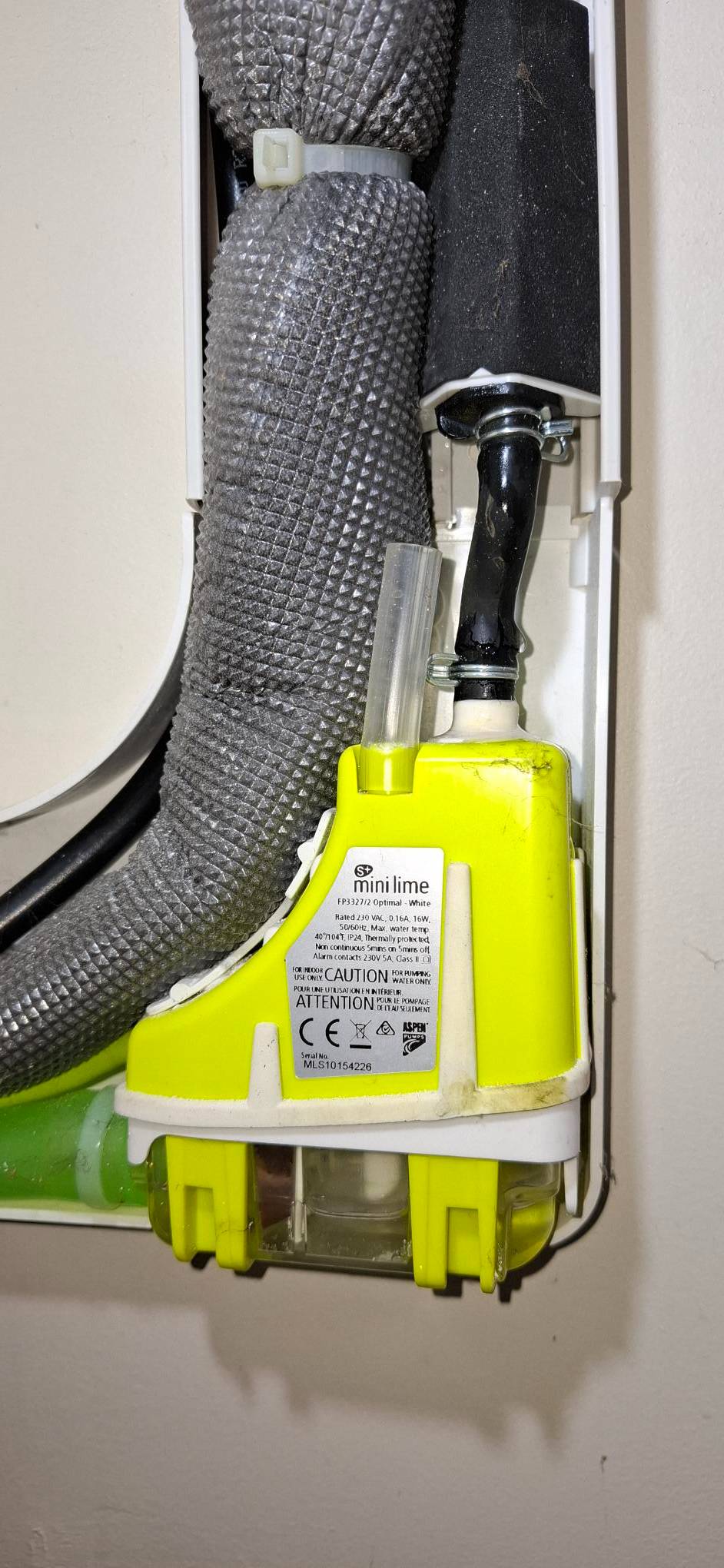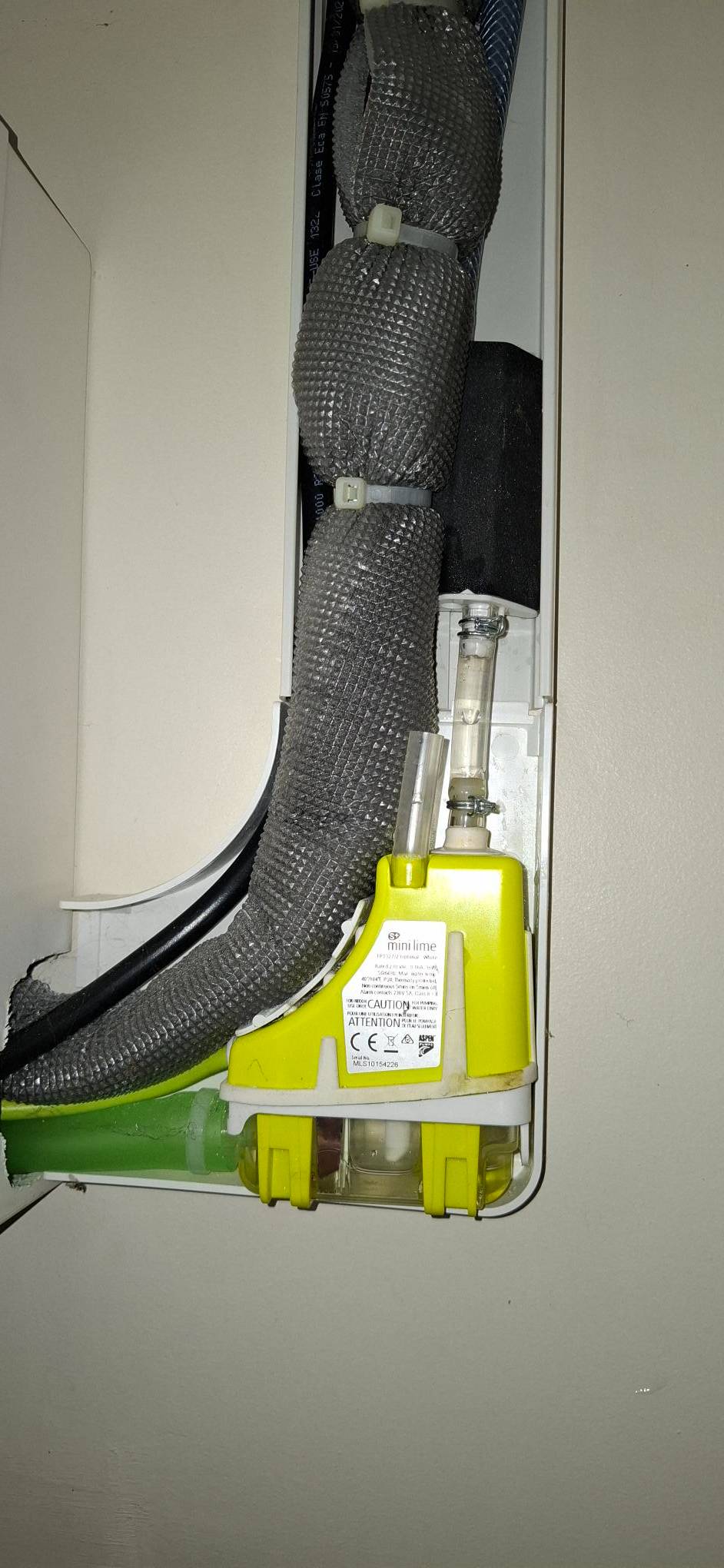 En arrivant sur place, nous constatons que le problème vient de la pompe de relevage située dans la goulotte à côté des liaisons frigorigènes.
