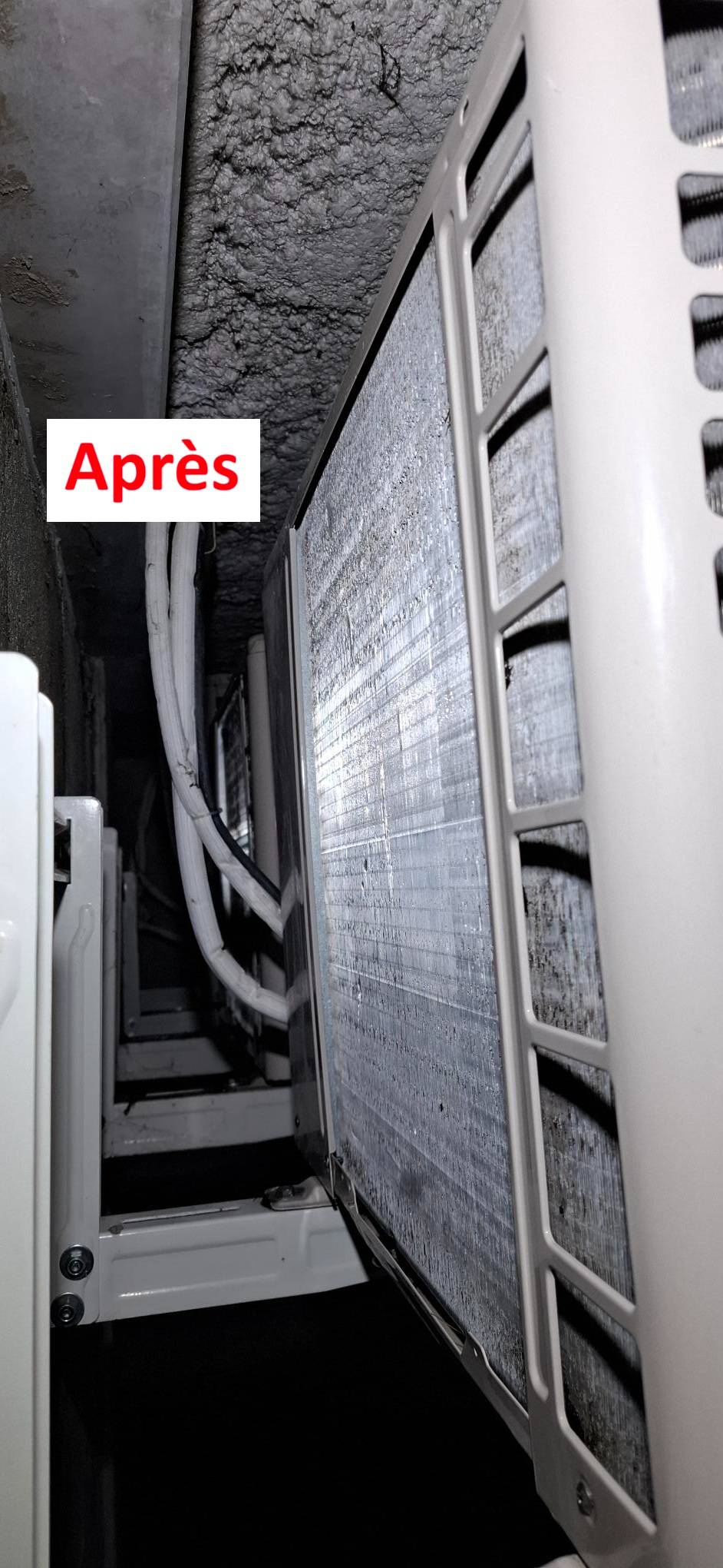 Jamais entretenue depuis plusieurs années, l'unité extérieure était profondément encrassée et l'installation ne faisait plus assez de froid, ni assez de chaud.
